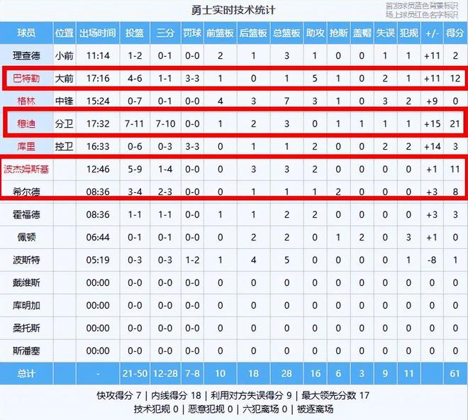 勇士(客场):穆迪21分3板、巴特勒12分1板5助、波杰姆斯基11分3板2助、希尔德8分1板1助2断、霍福德3分2板2助、库里3分1板2助、理查德2分3板1助、波斯特1分5板、格林7板3助、佩顿2板2帽